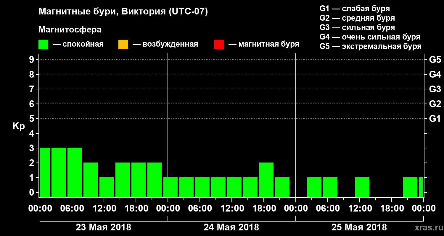 Изменения геомагнитного индекса Kp с 23 по 25 мая 2018 года для средних широт