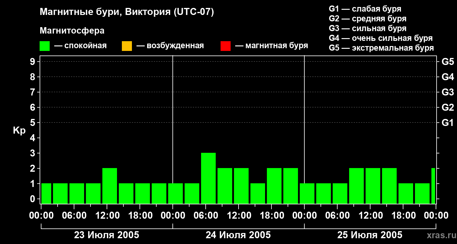 Изменения геомагнитного индекса Kp с 23 по 25 июля 2005 года для средних широт