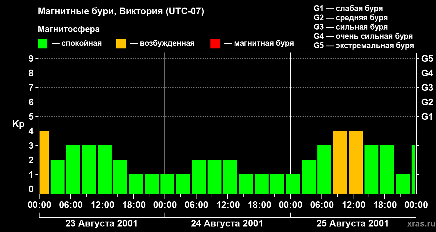 Изменения геомагнитного индекса Kp с 23 по 25 августа 2001 года для средних широт