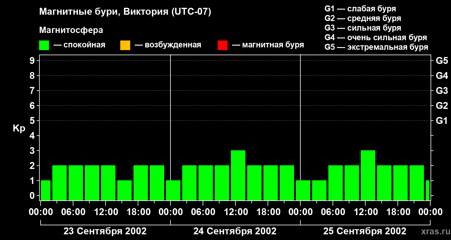 Изменения геомагнитного индекса Kp с 23 по 25 сентября 2002 года для средних широт