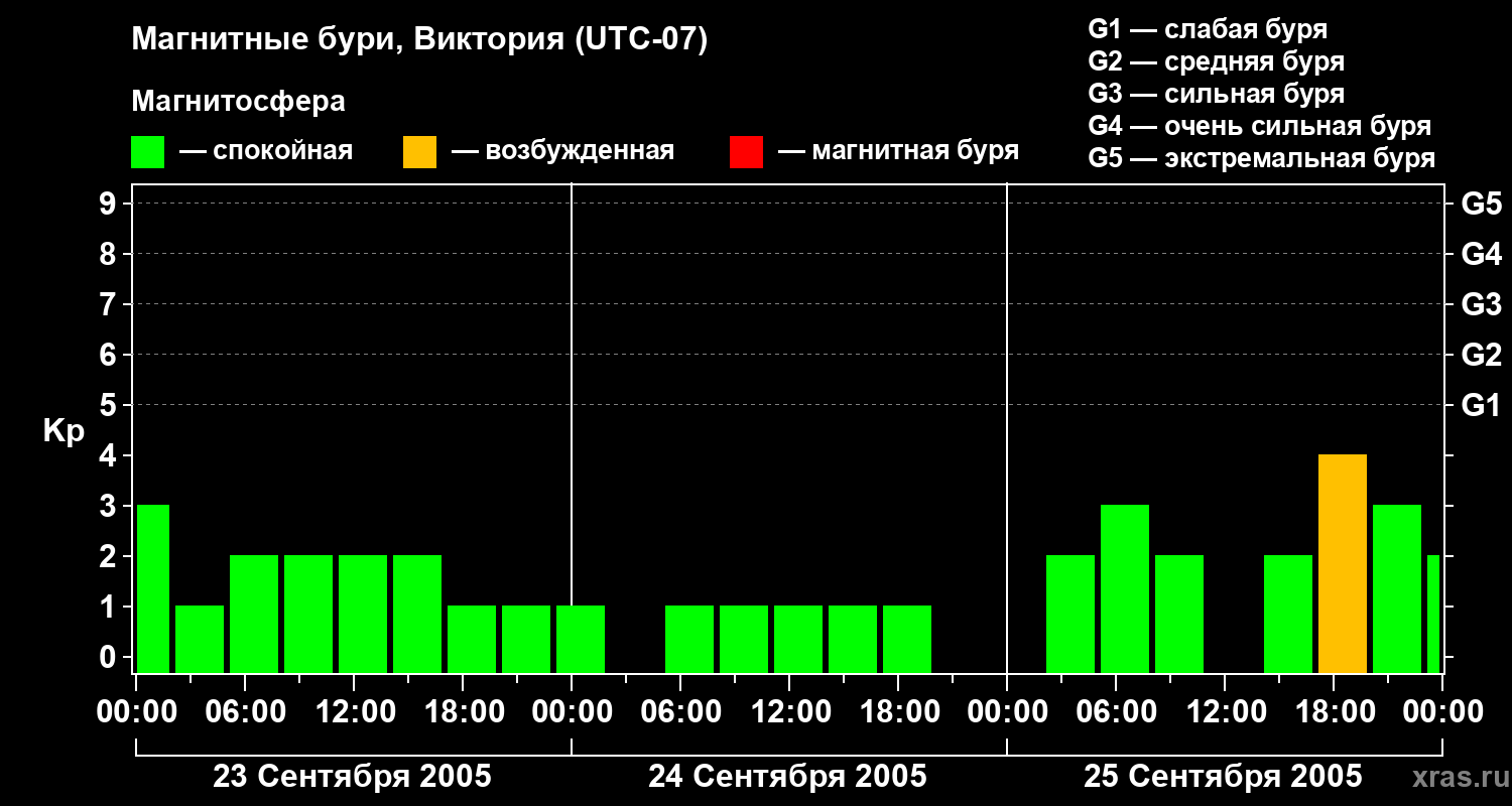 Изменения геомагнитного индекса Kp с 23 по 25 сентября 2005 года для средних широт