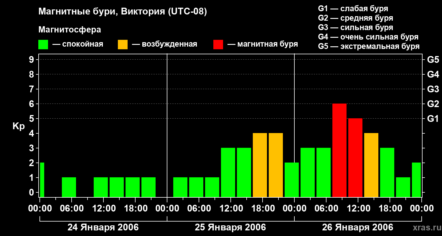Изменения геомагнитного индекса Kp с 24 по 26 января 2006 года для средних широт