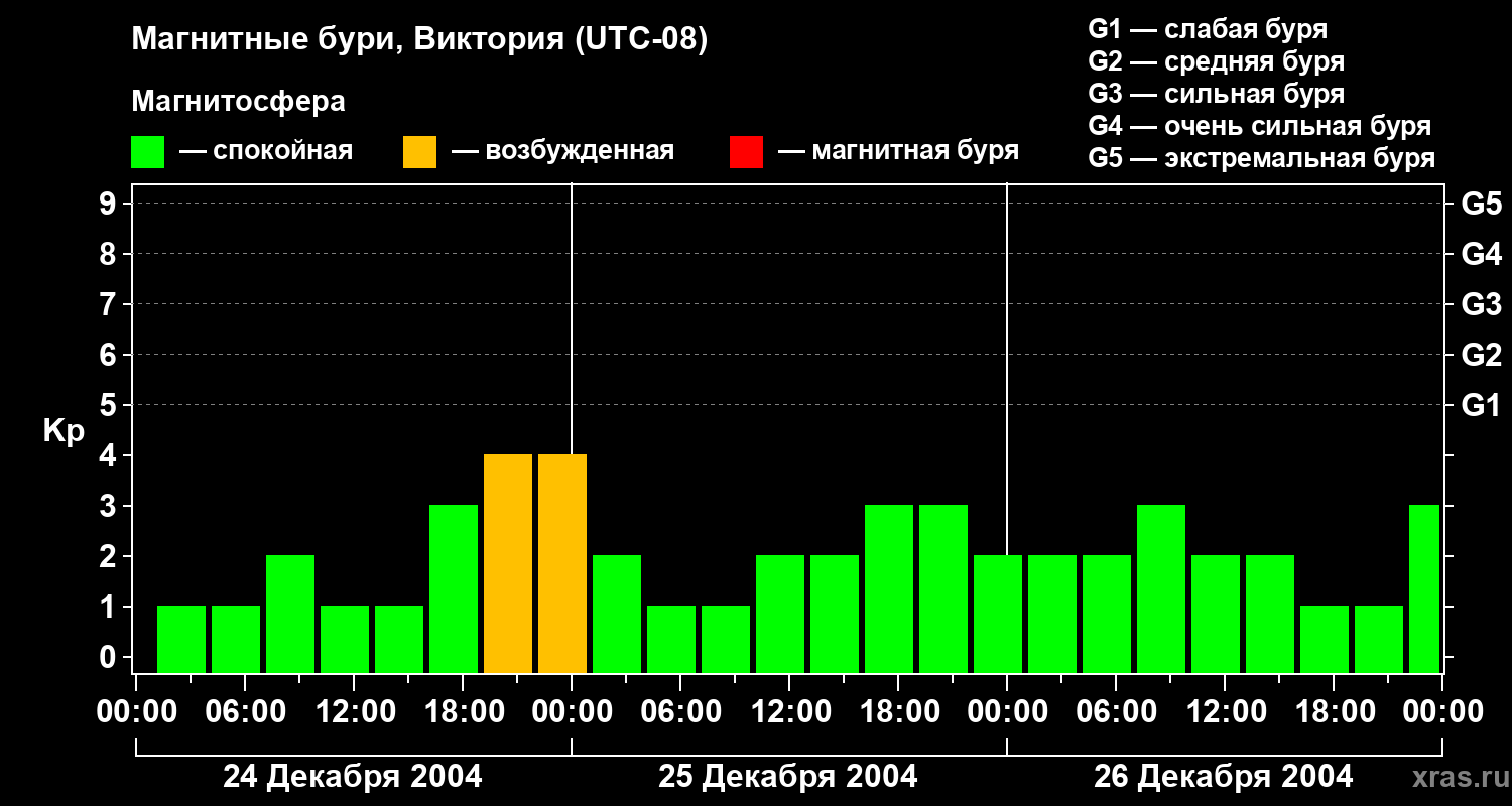 Изменения геомагнитного индекса Kp с 24 по 26 декабря 2004 года для средних широт