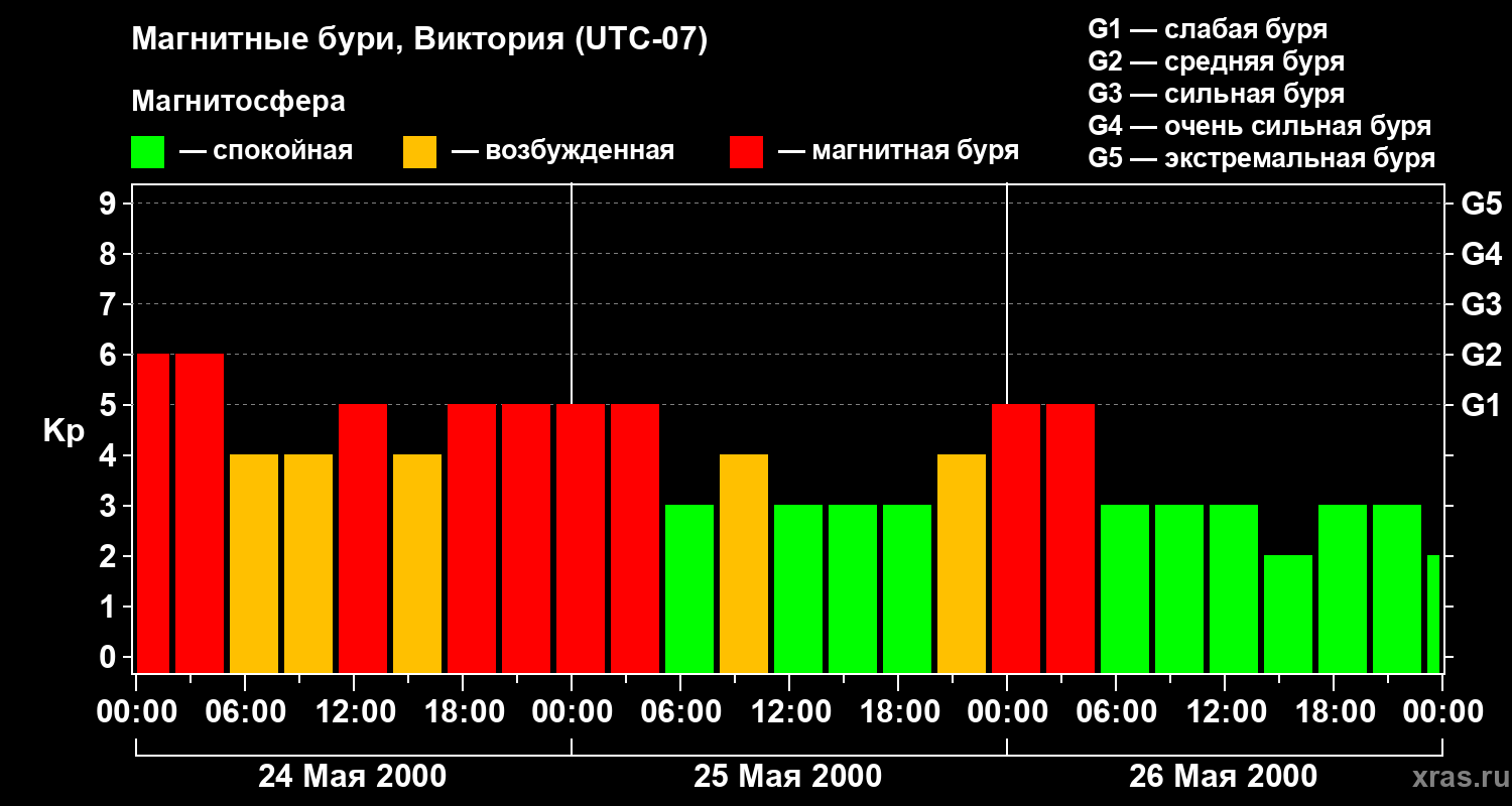 Изменения геомагнитного индекса Kp с 24 по 26 мая 2000 года для средних широт