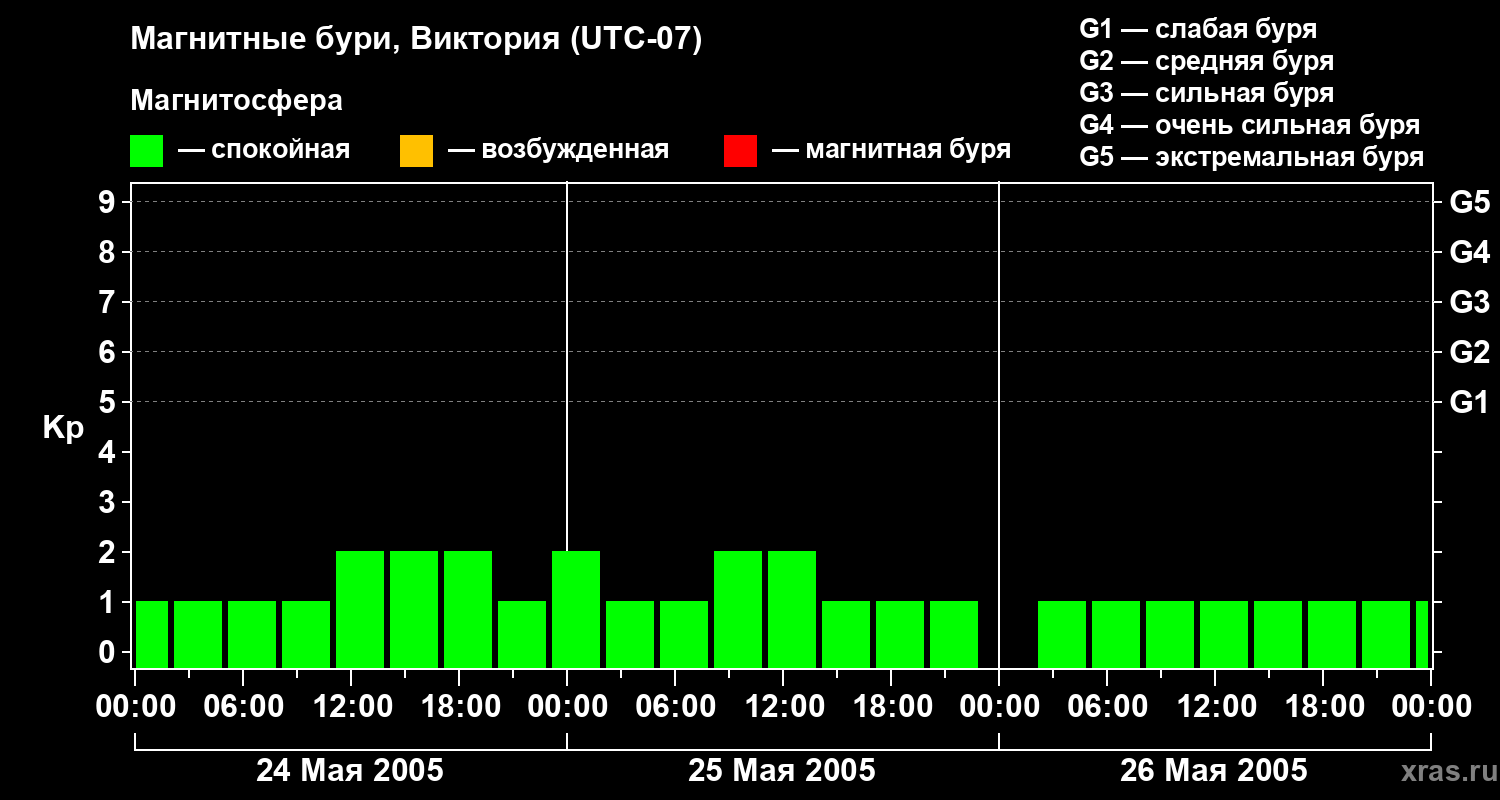 Изменения геомагнитного индекса Kp с 24 по 26 мая 2005 года для средних широт