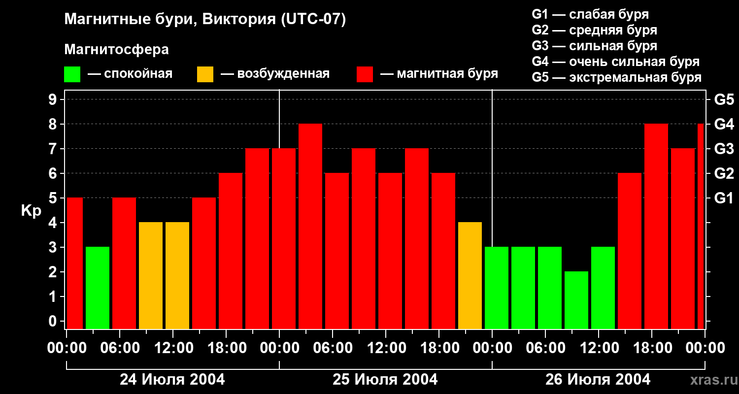 Изменения геомагнитного индекса Kp с 24 по 26 июля 2004 года для средних широт
