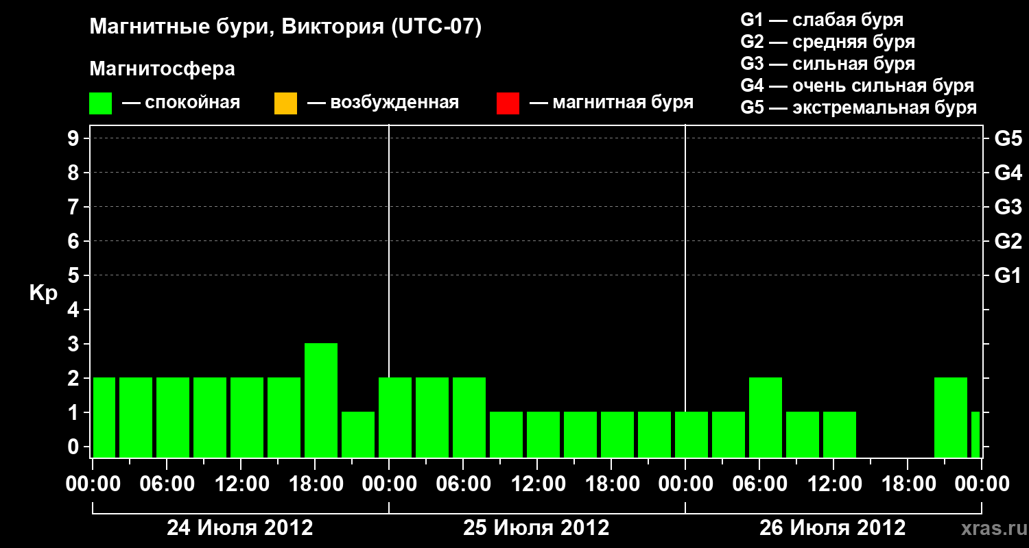 Изменения геомагнитного индекса Kp с 24 по 26 июля 2012 года для средних широт