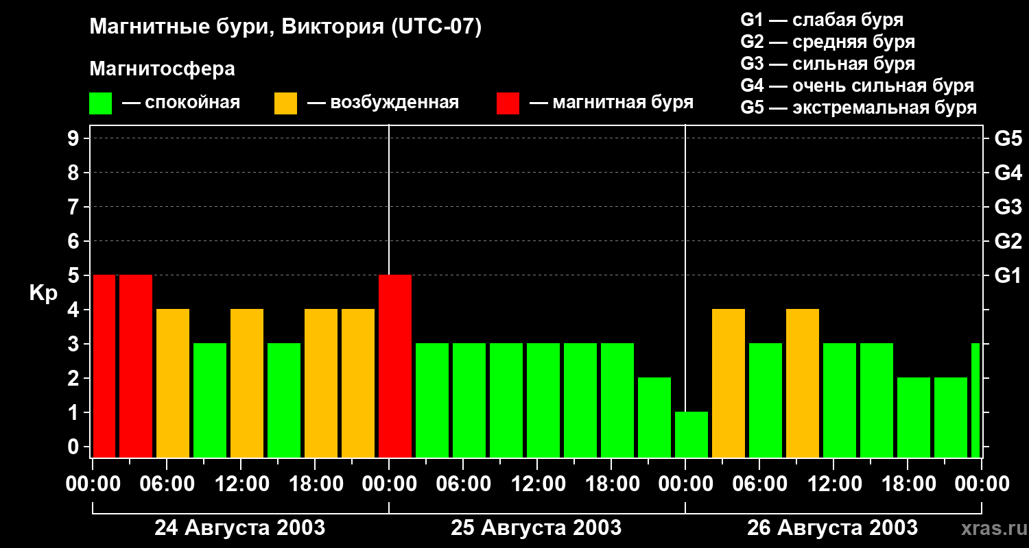 Изменения геомагнитного индекса Kp с 24 по 26 августа 2003 года для средних широт