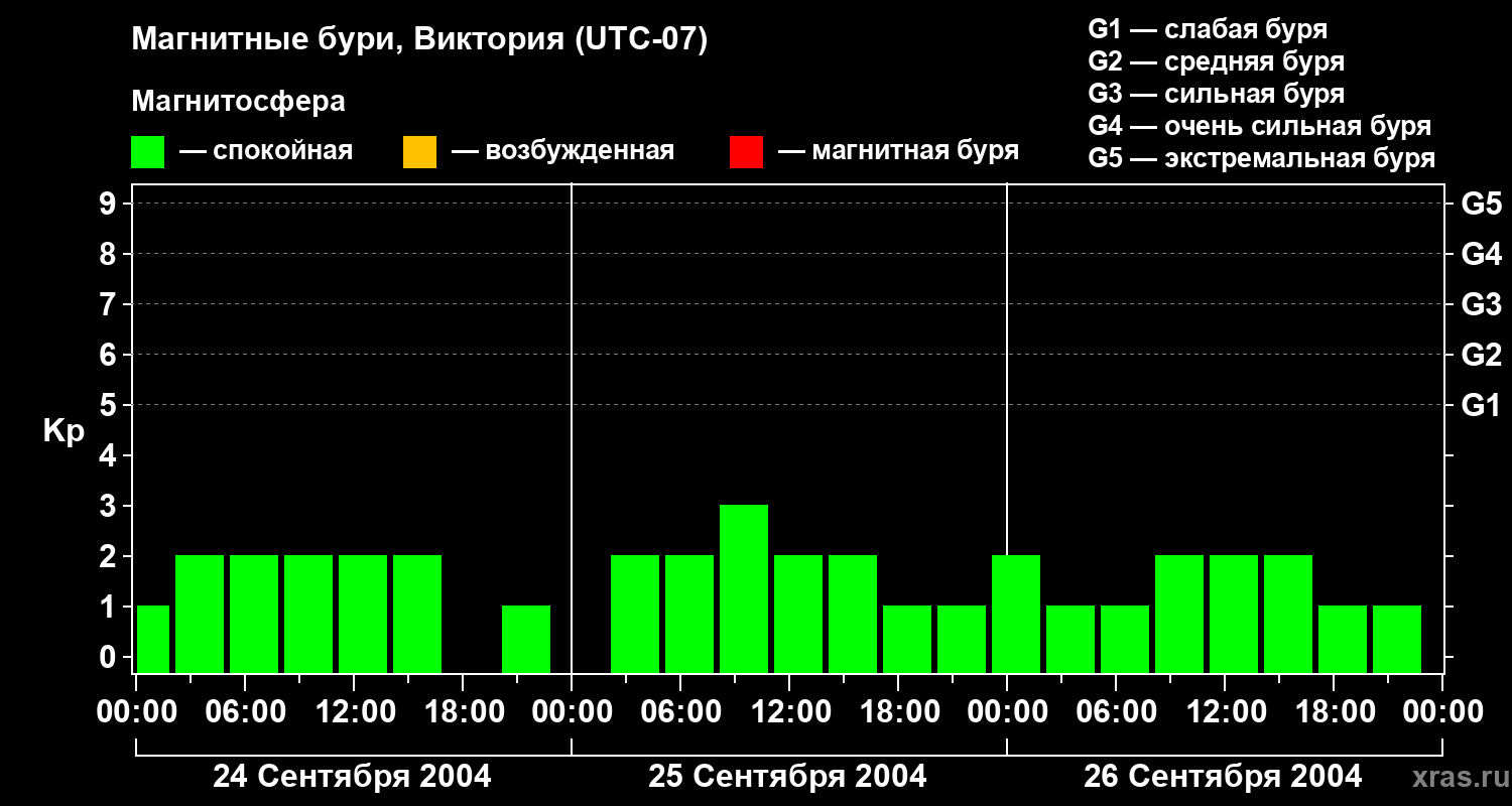 Изменения геомагнитного индекса Kp с 24 по 26 сентября 2004 года для средних широт