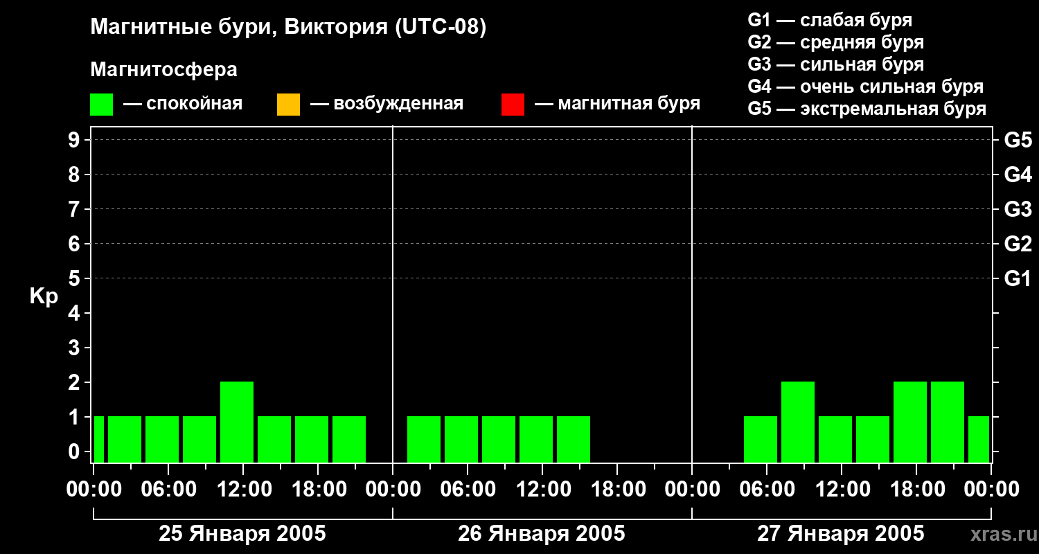Изменения геомагнитного индекса Kp с 25 по 27 января 2005 года для средних широт