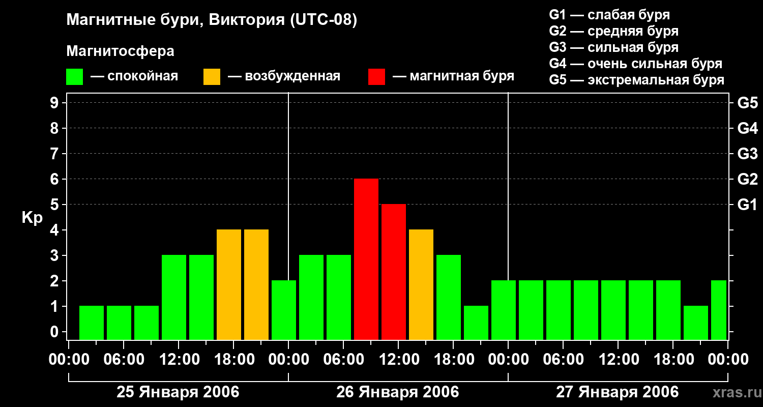 Изменения геомагнитного индекса Kp с 25 по 27 января 2006 года для средних широт