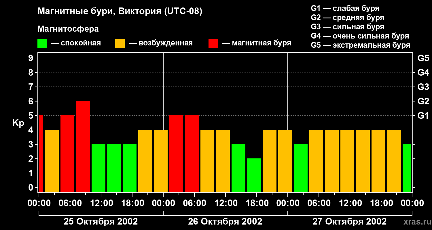 Изменения геомагнитного индекса Kp с 25 по 27 октября 2002 года для средних широт