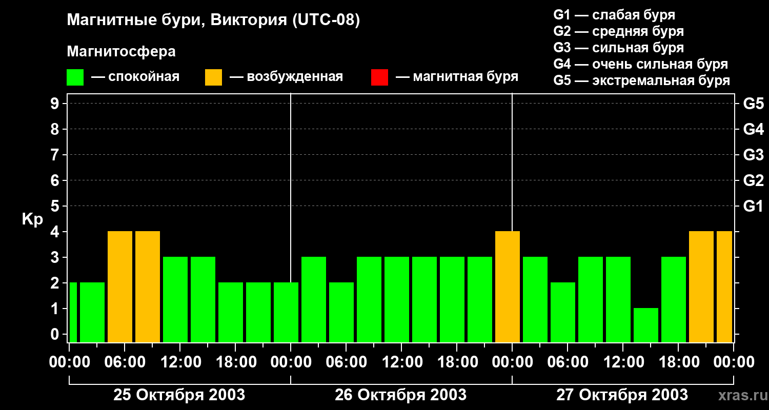 Изменения геомагнитного индекса Kp с 25 по 27 октября 2003 года для средних широт