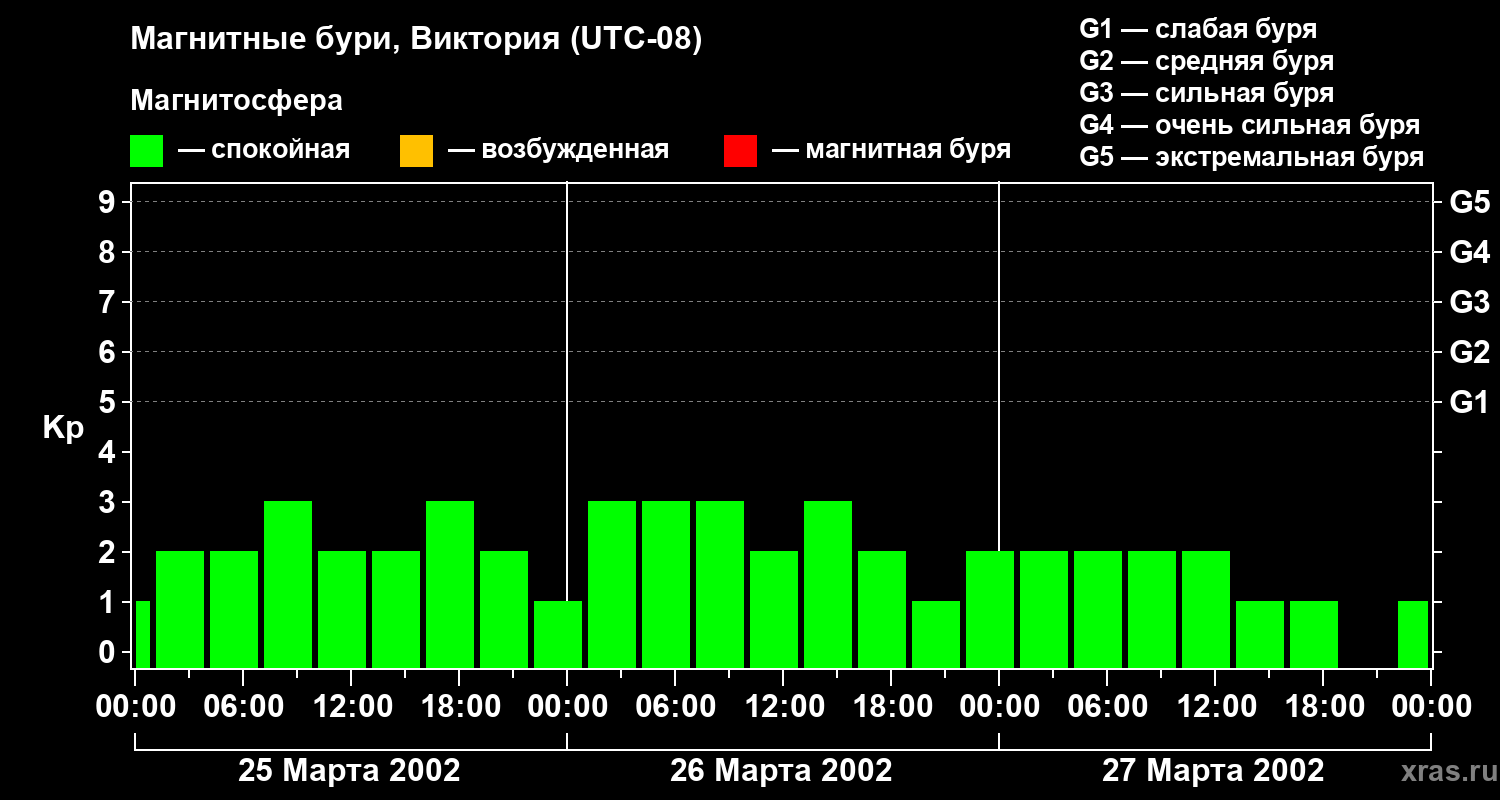 Изменения геомагнитного индекса Kp с 25 по 27 марта 2002 года для средних широт