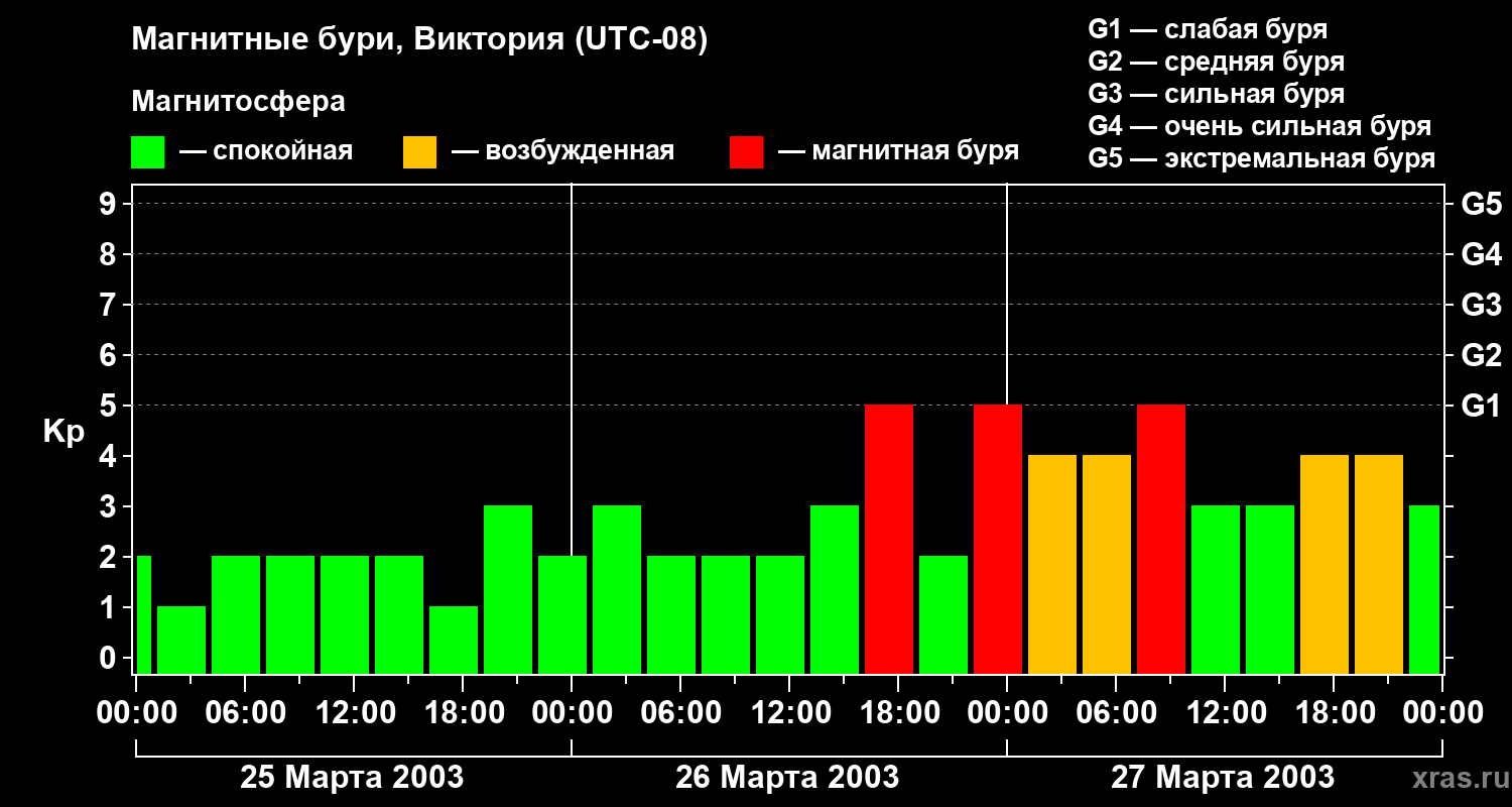 Изменения геомагнитного индекса Kp с 25 по 27 марта 2003 года для средних широт