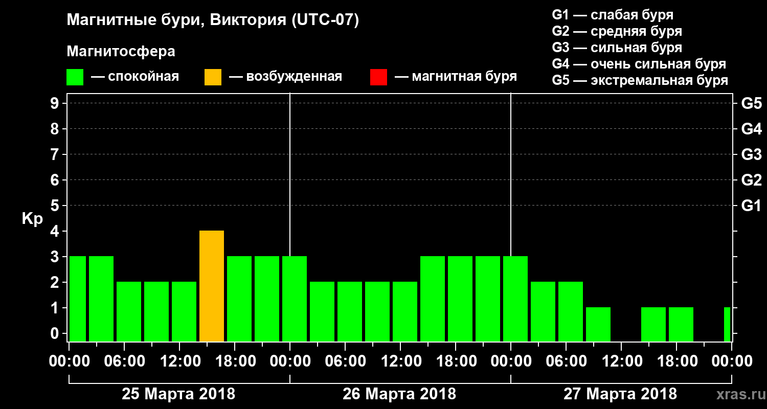 Изменения геомагнитного индекса Kp с 25 по 27 марта 2018 года для средних широт