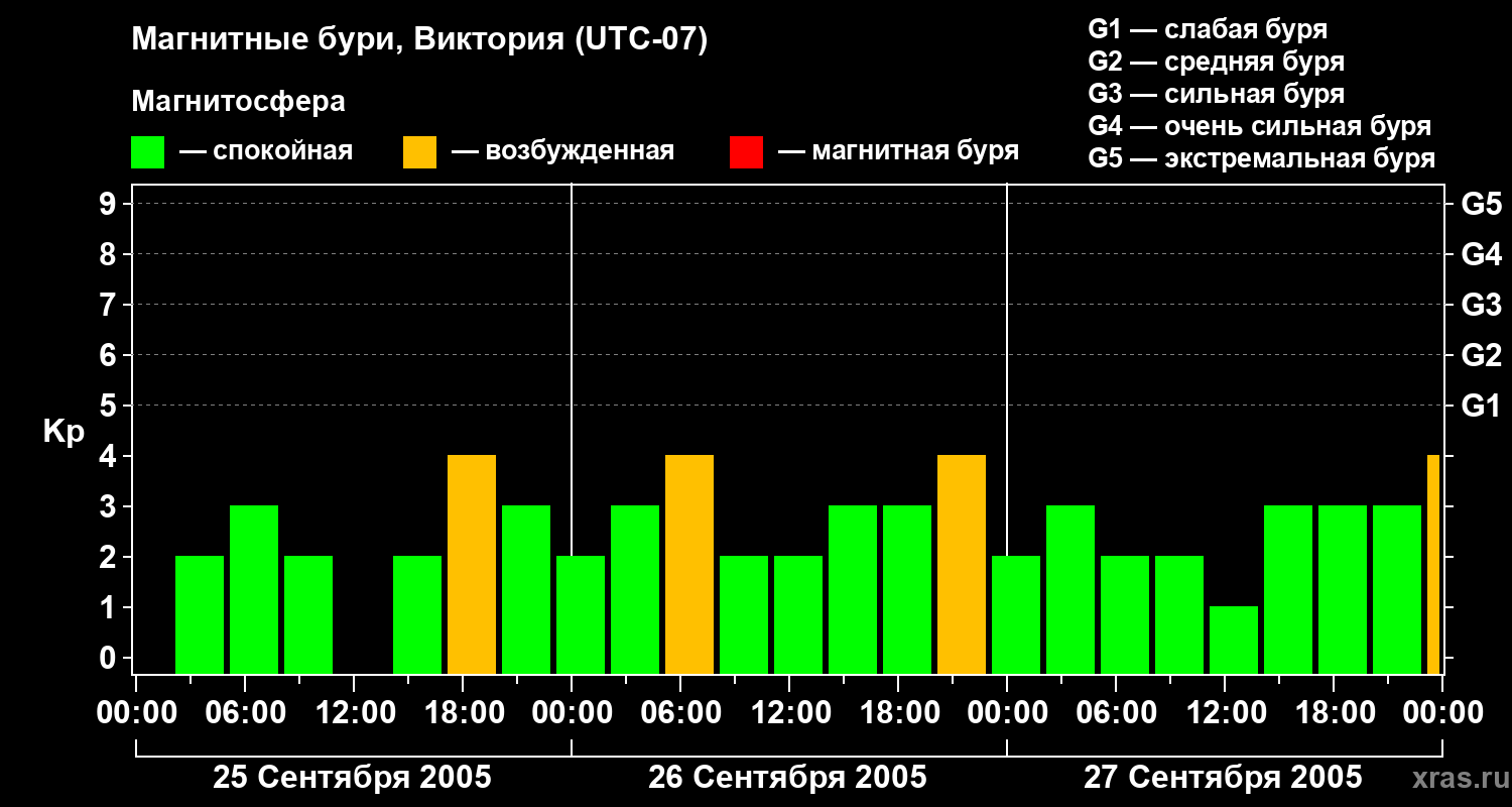 Изменения геомагнитного индекса Kp с 25 по 27 сентября 2005 года для средних широт