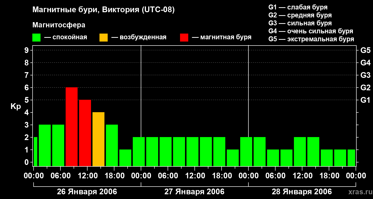 Изменения геомагнитного индекса Kp с 26 по 28 января 2006 года для средних широт