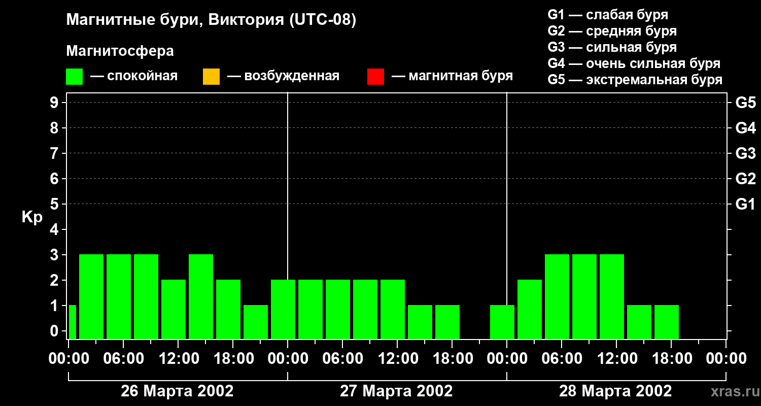 Изменения геомагнитного индекса Kp с 26 по 28 марта 2002 года для средних широт