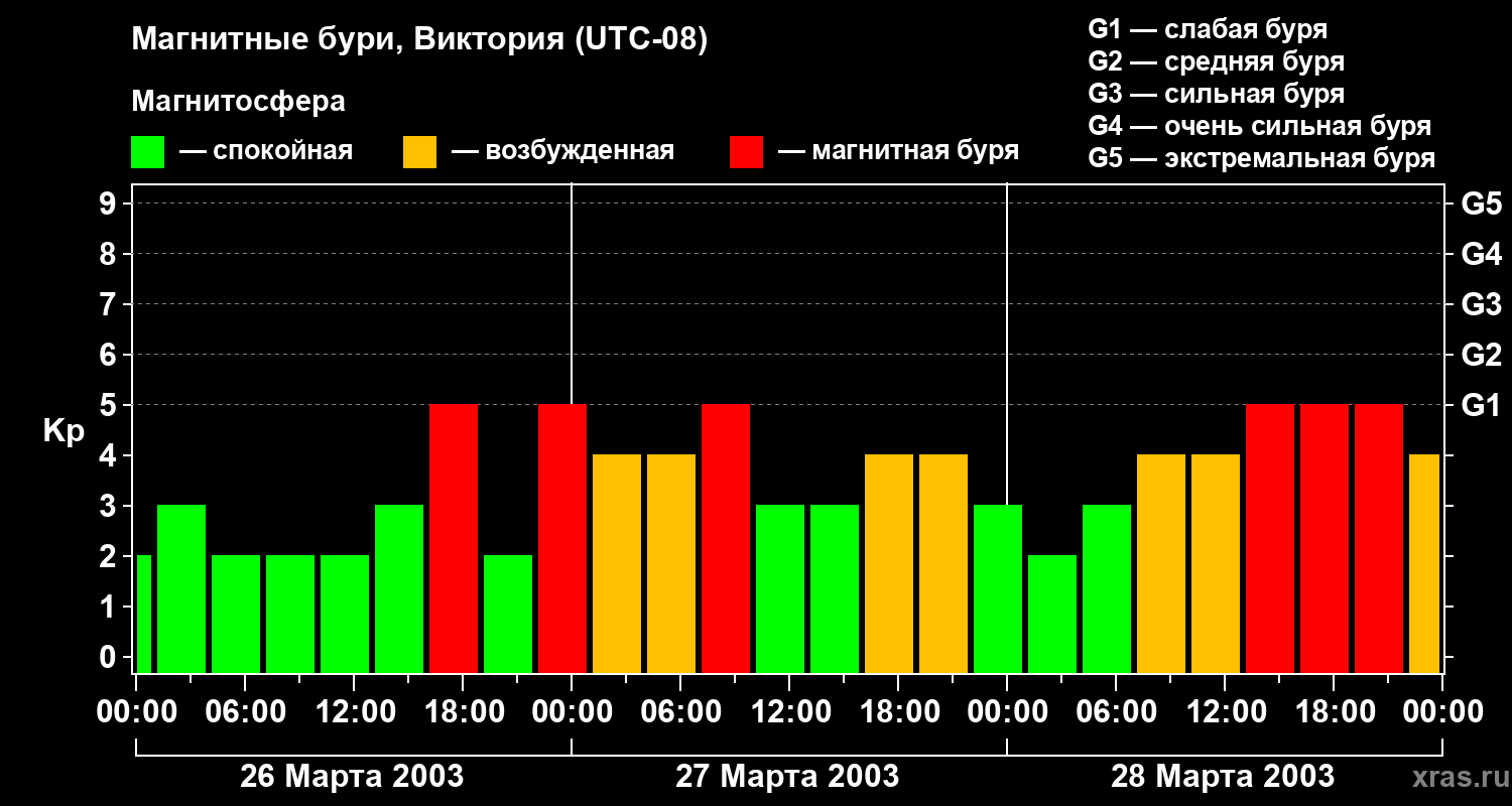 Изменения геомагнитного индекса Kp с 26 по 28 марта 2003 года для средних широт