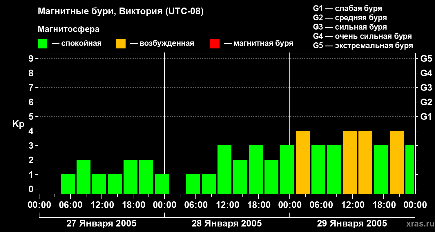 Изменения геомагнитного индекса Kp с 27 по 29 января 2005 года для средних широт