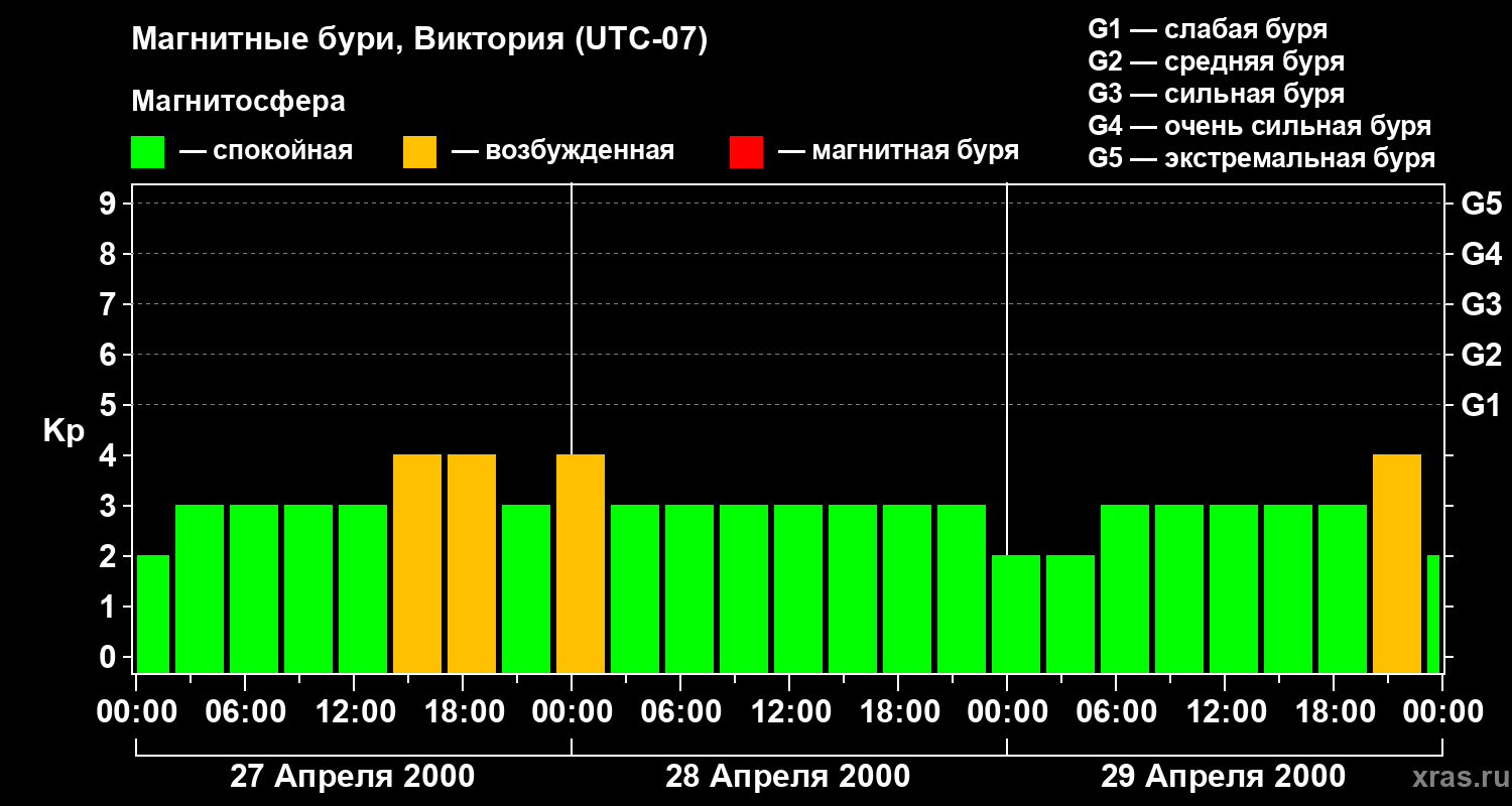 Изменения геомагнитного индекса Kp с 27 по 29 апреля 2000 года для средних широт
