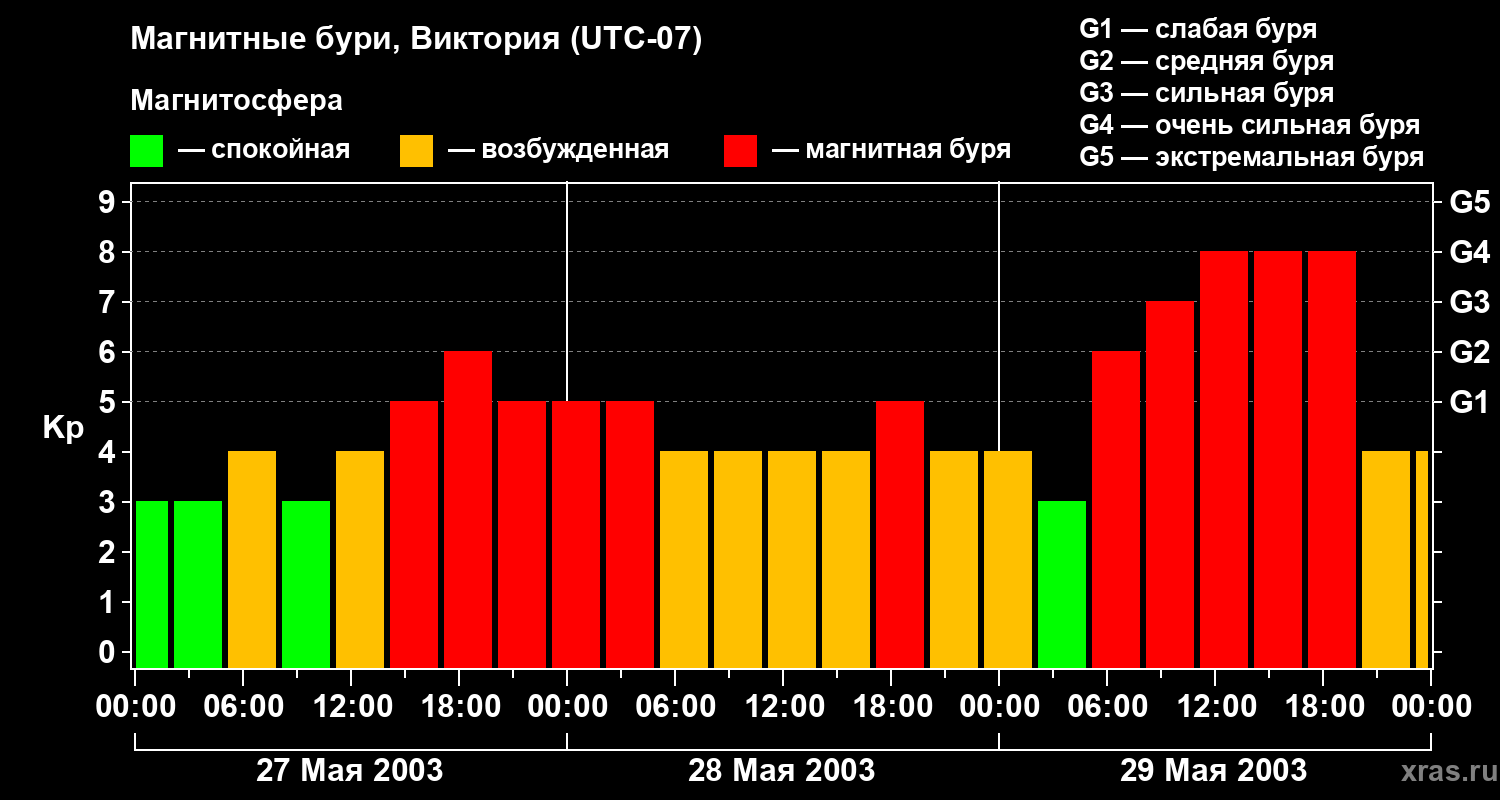 Изменения геомагнитного индекса Kp с 27 по 29 мая 2003 года для средних широт