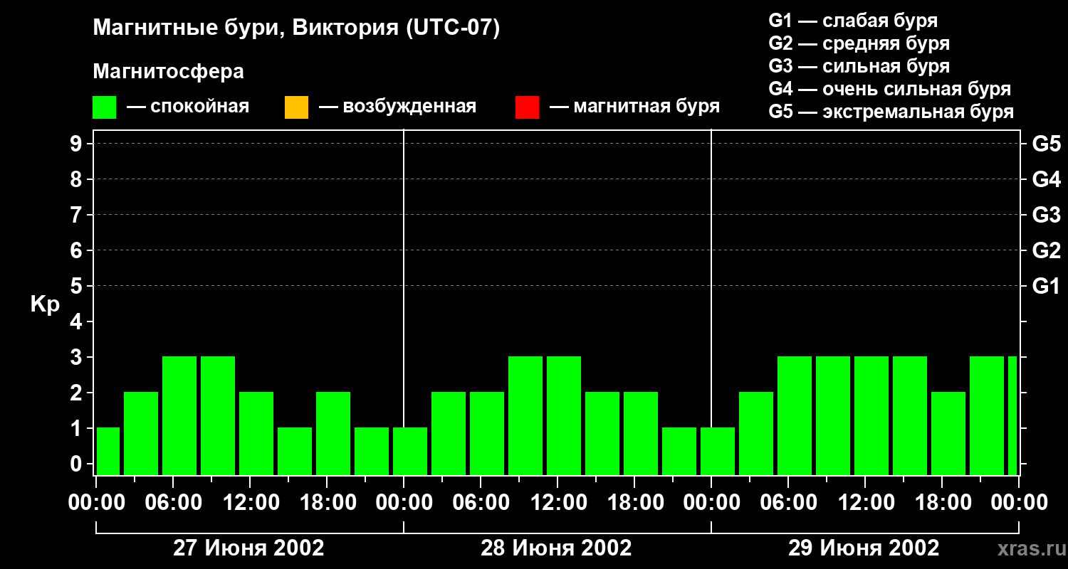 Изменения геомагнитного индекса Kp с 27 по 29 июня 2002 года для средних широт