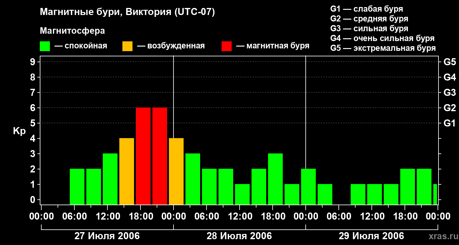 Изменения геомагнитного индекса Kp с 27 по 29 июля 2006 года для средних широт