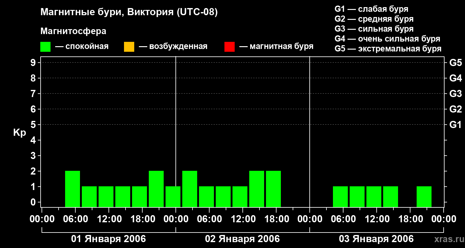 Изменения геомагнитного индекса Kp с 1 по 3 января 2006 года для средних широт