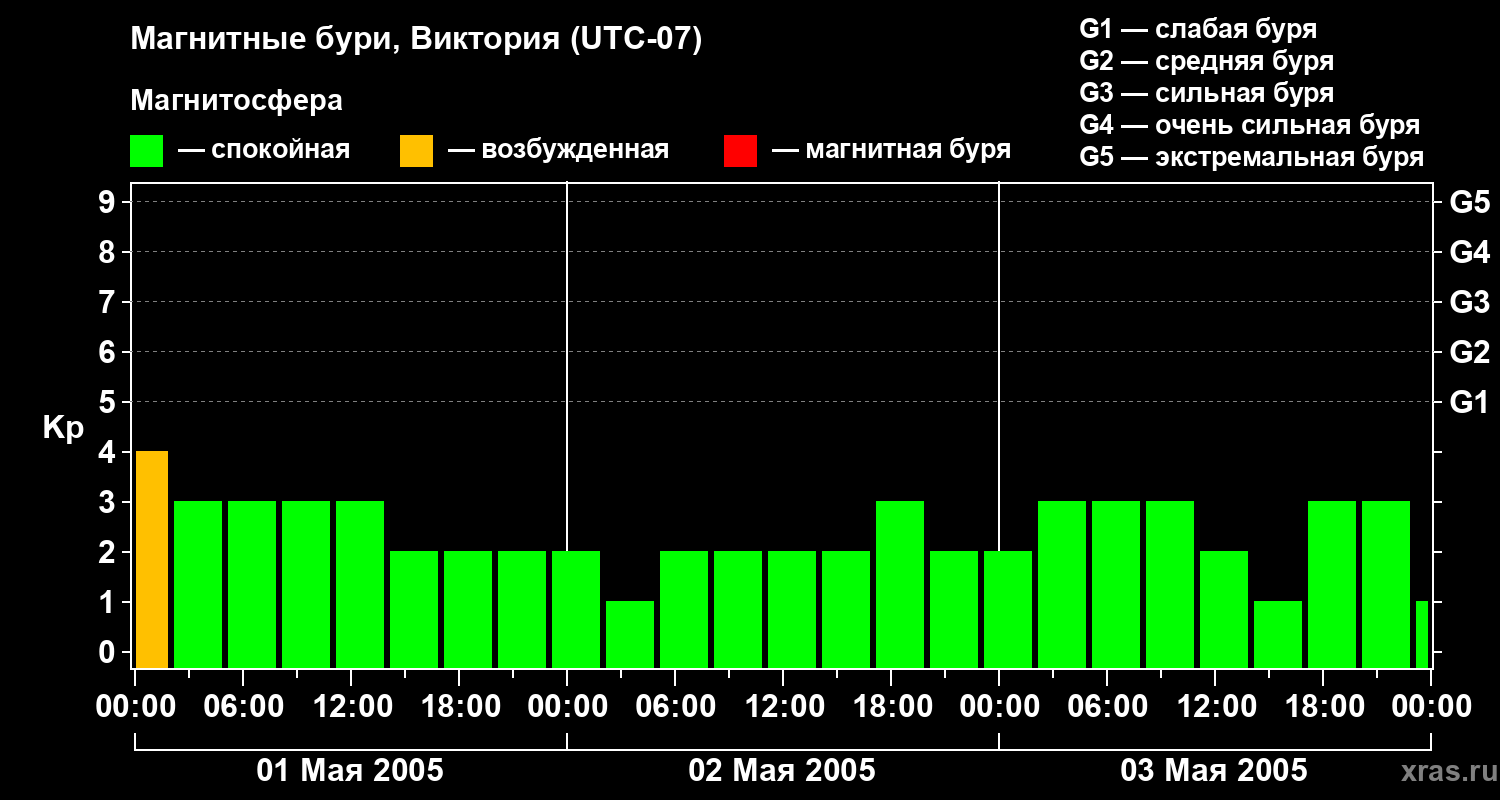 Изменения геомагнитного индекса Kp с 1 по 3 мая 2005 года для средних широт