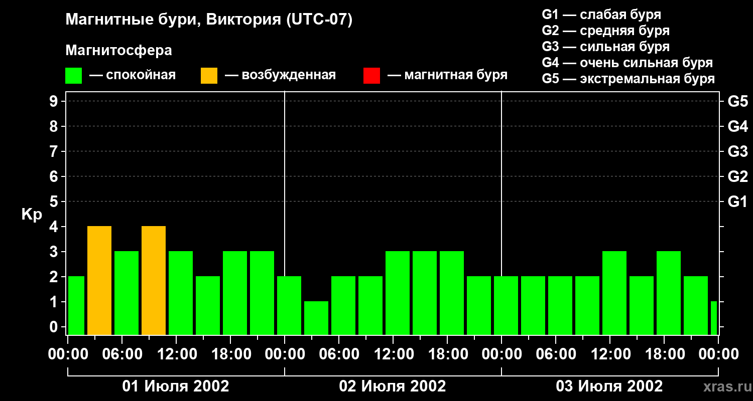 Изменения геомагнитного индекса Kp с 1 по 3 июля 2002 года для средних широт
