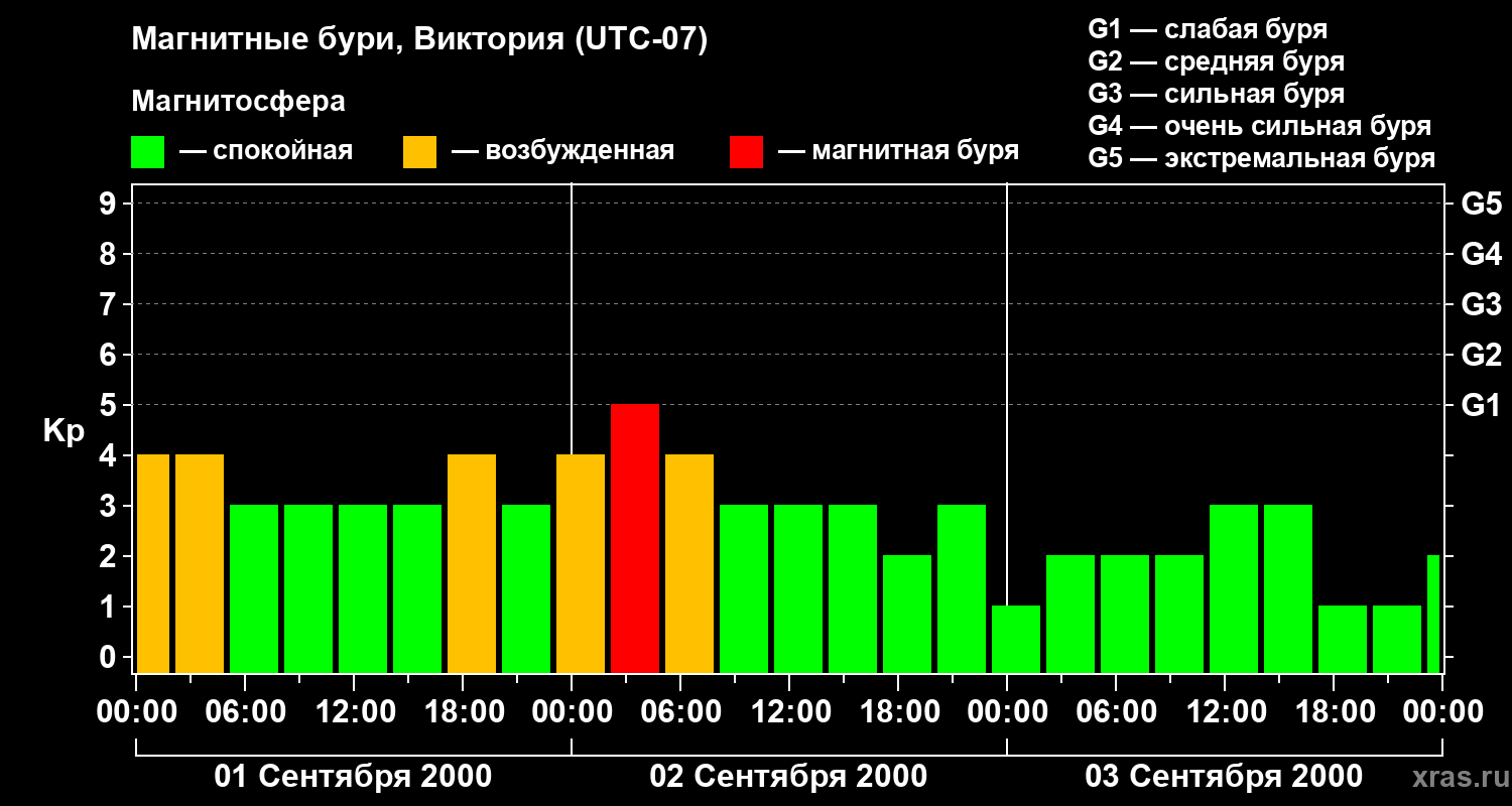 Изменения геомагнитного индекса Kp с 1 по 3 сентября 2000 года для средних широт