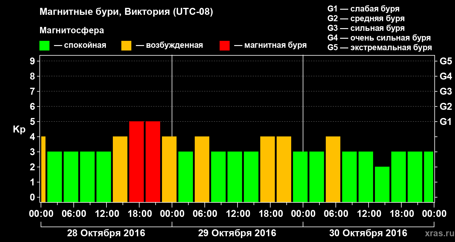 Изменения геомагнитного индекса Kp с 28 по 30 октября 2016 года для средних широт