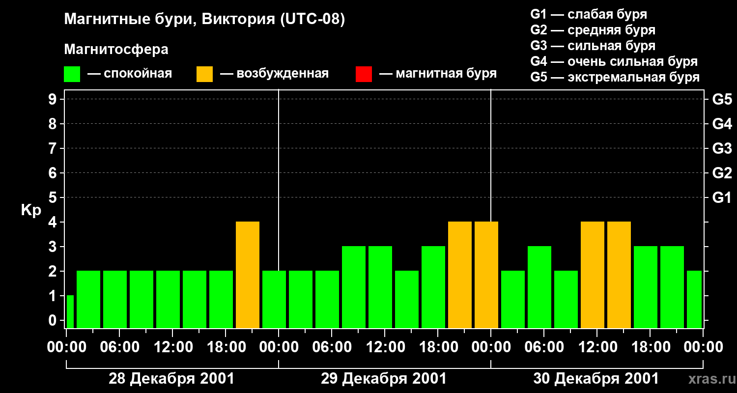 Изменения геомагнитного индекса Kp с 28 по 30 декабря 2001 года для средних широт