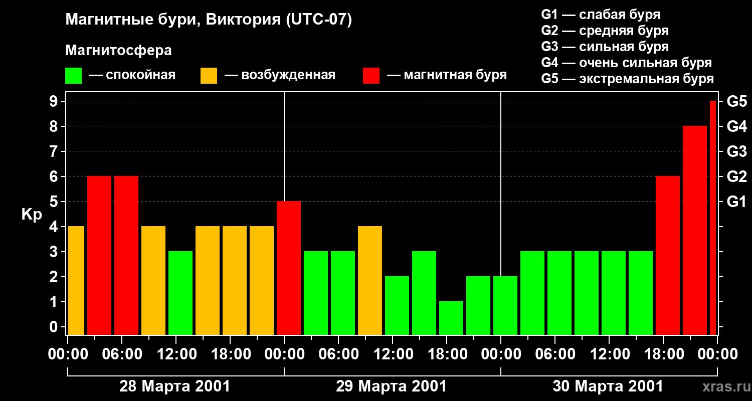 Изменения геомагнитного индекса Kp с 28 по 30 марта 2001 года для средних широт