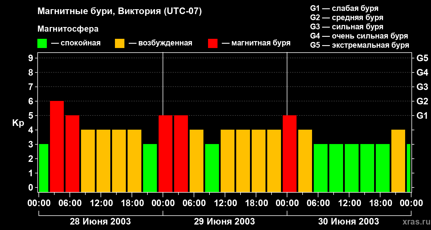 Изменения геомагнитного индекса Kp с 28 по 30 июня 2003 года для средних широт