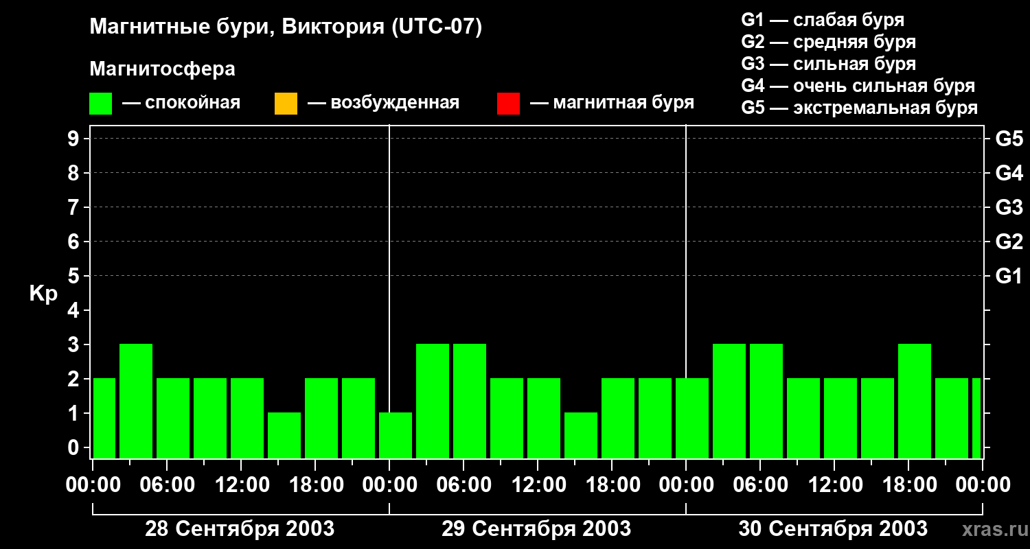 Изменения геомагнитного индекса Kp с 28 по 30 сентября 2003 года для средних широт