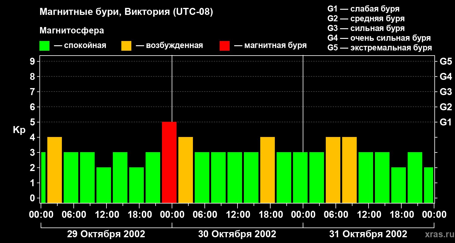 Изменения геомагнитного индекса Kp с 29 по 31 октября 2002 года для средних широт