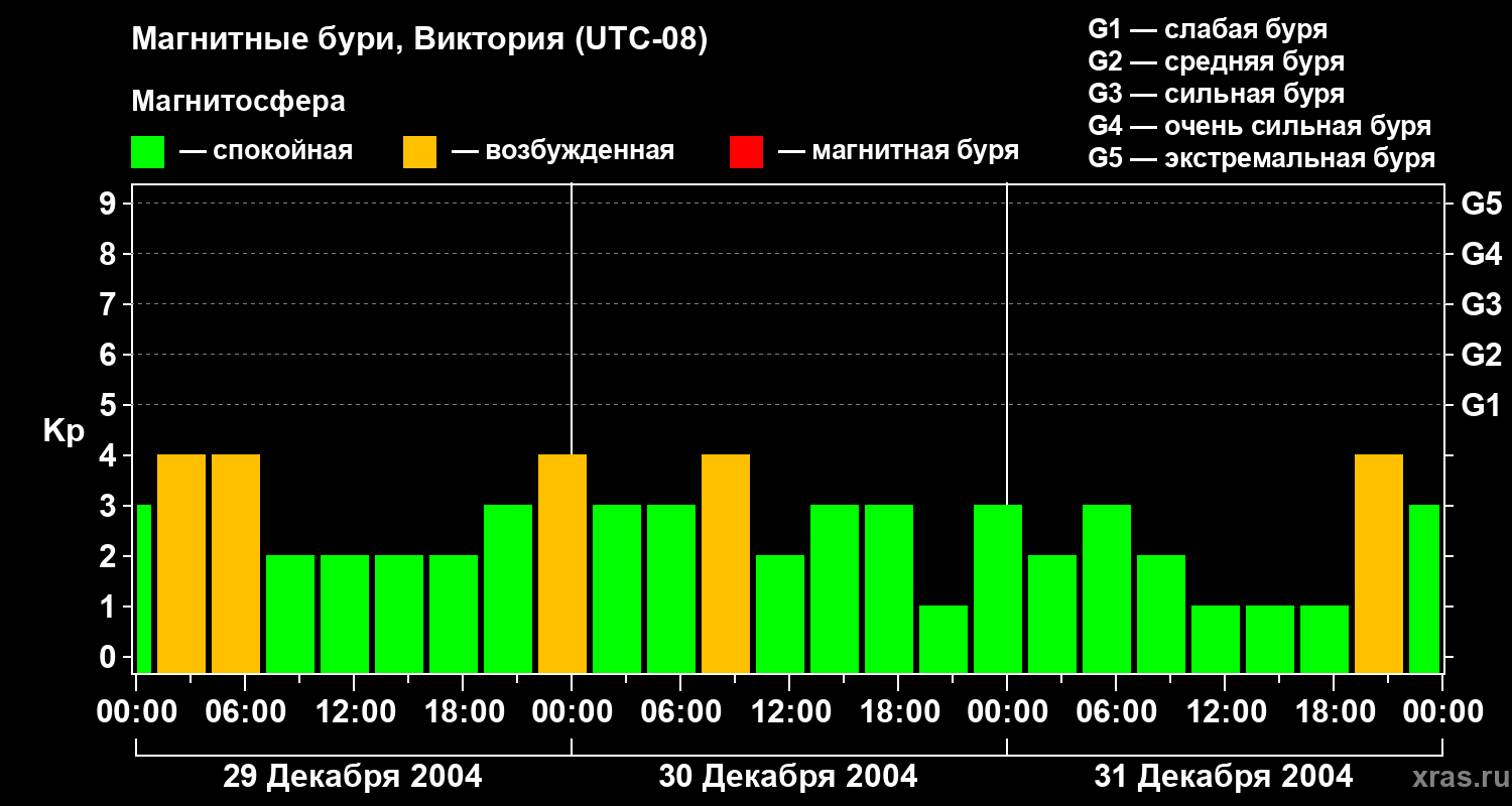 Изменения геомагнитного индекса Kp с 29 по 31 декабря 2004 года для средних широт