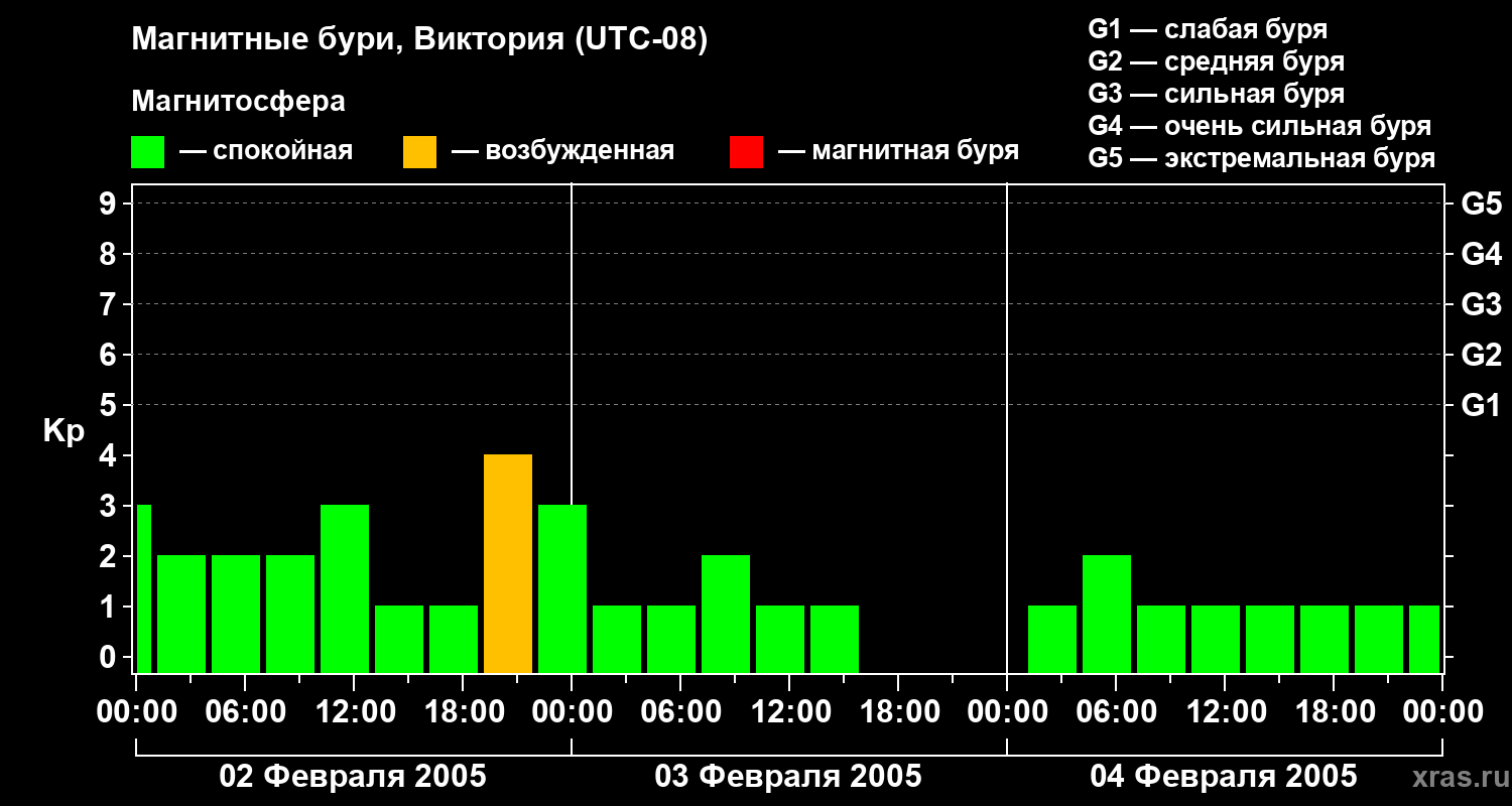 Изменения геомагнитного индекса Kp с 2 по 4 февраля 2005 года для средних широт