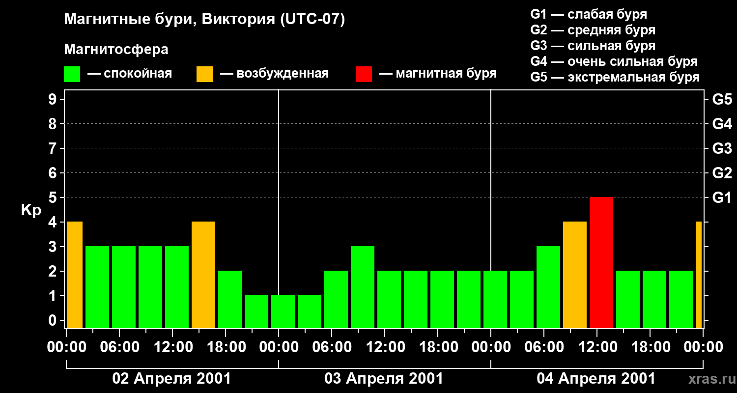 Изменения геомагнитного индекса Kp с 2 по 4 апреля 2001 года для средних широт