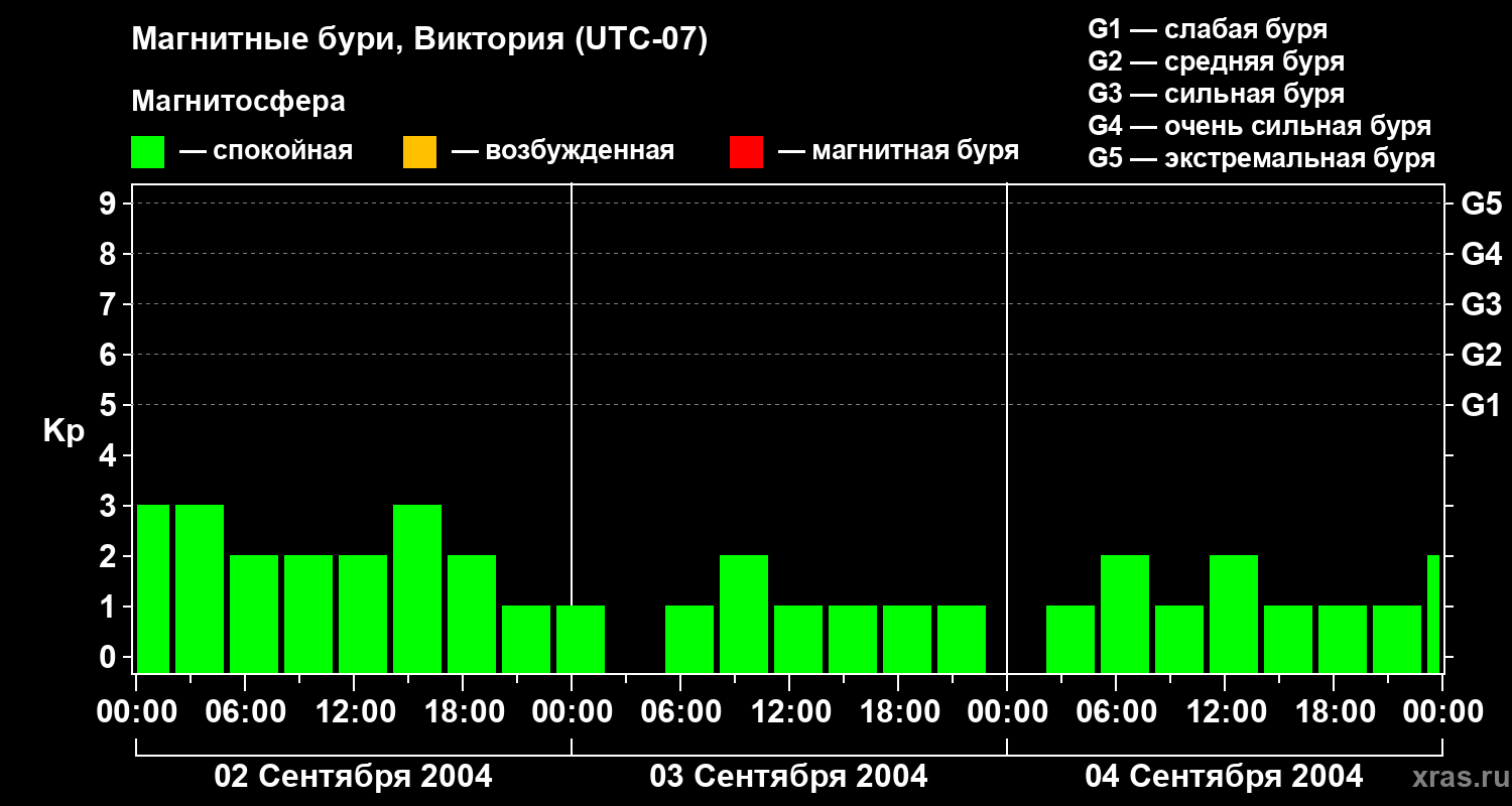 Изменения геомагнитного индекса Kp с 2 по 4 сентября 2004 года для средних широт