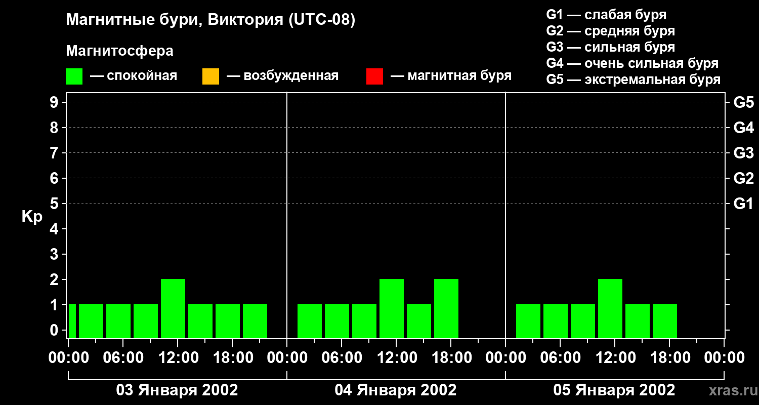 Изменения геомагнитного индекса Kp с 3 по 5 января 2002 года для средних широт