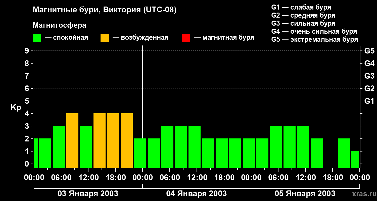 Изменения геомагнитного индекса Kp с 3 по 5 января 2003 года для средних широт