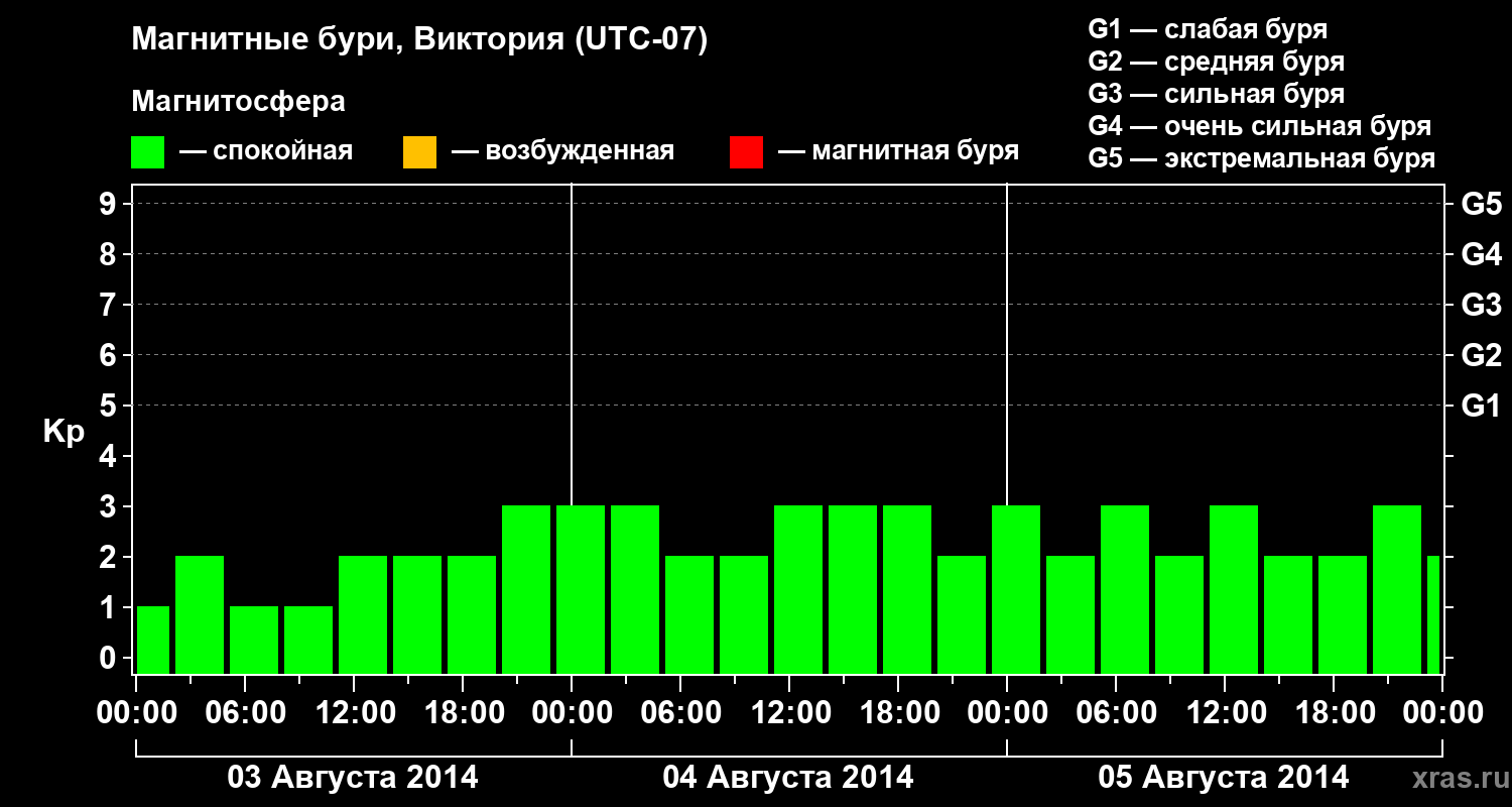 Изменения геомагнитного индекса Kp с 3 по 5 августа 2014 года для средних широт