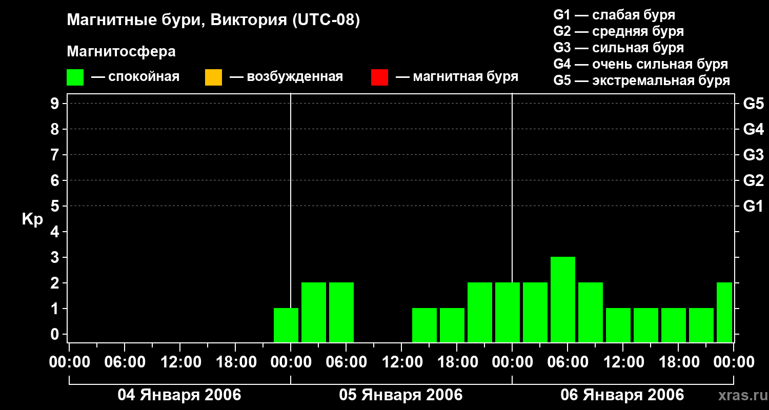 Изменения геомагнитного индекса Kp с 4 по 6 января 2006 года для средних широт