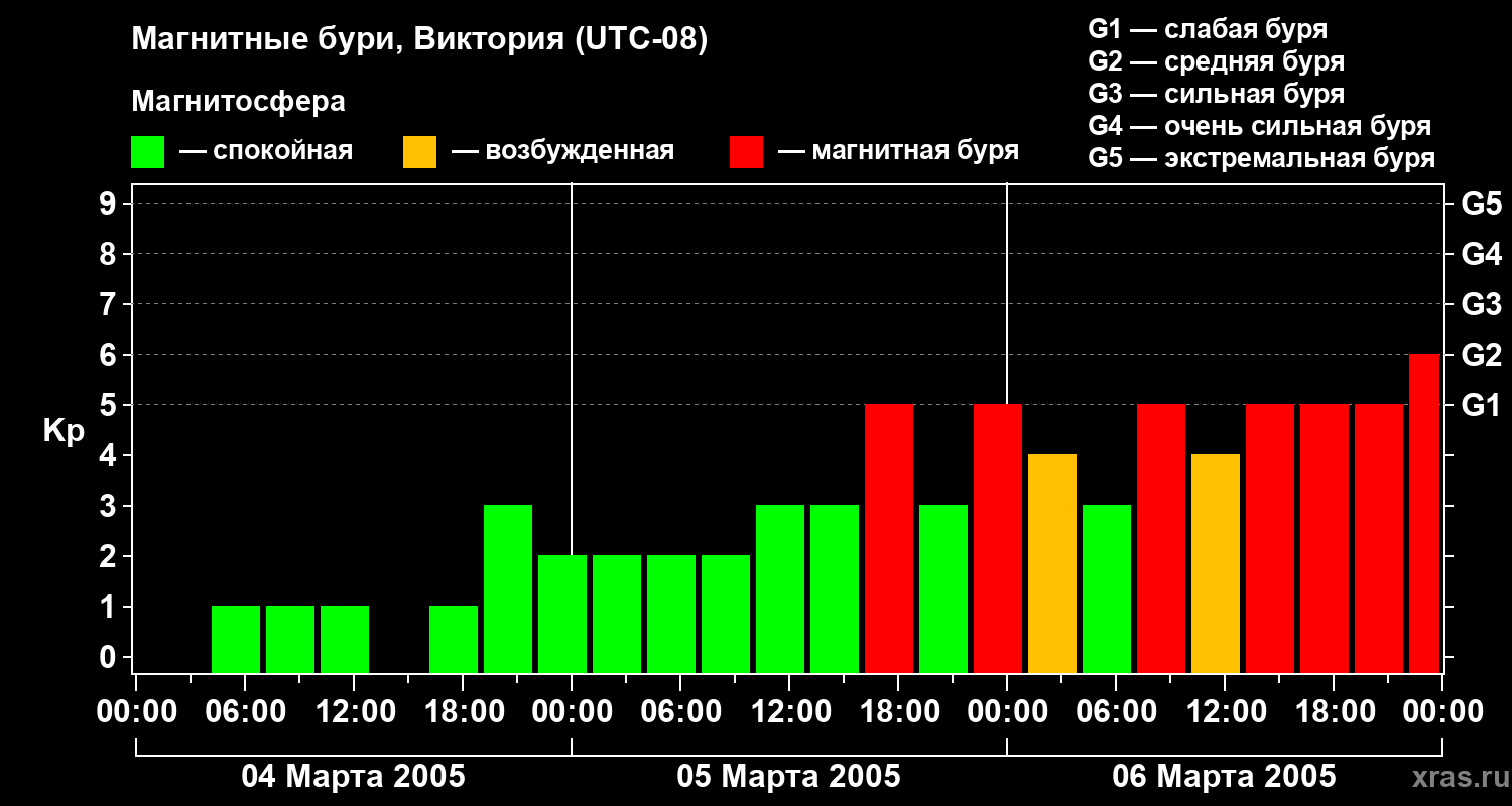 Изменения геомагнитного индекса Kp с 4 по 6 марта 2005 года для средних широт