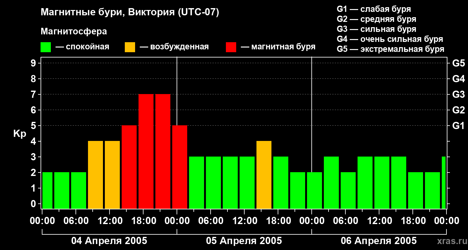 Изменения геомагнитного индекса Kp с 4 по 6 апреля 2005 года для средних широт