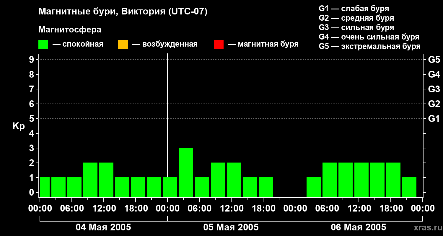 Изменения геомагнитного индекса Kp с 4 по 6 мая 2005 года для средних широт